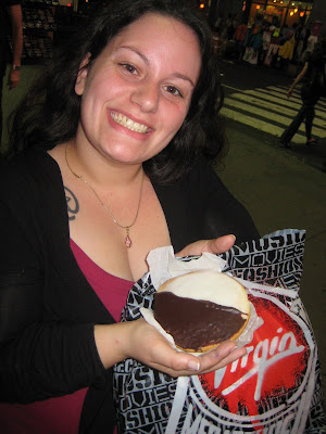 Seinfeld had it right, this cookie is neither a cake, or a cookie. But eating it cautiously, black and white icing at the same time makes for one hell of a yummy treat. We picked these up in Times Square at the Roxie Deli.